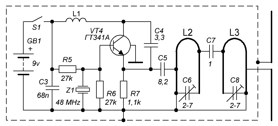 Для получения сигнала с АМ в цепь питания включен НЧ-мультивибратор на частоту 800-1000 Гц.